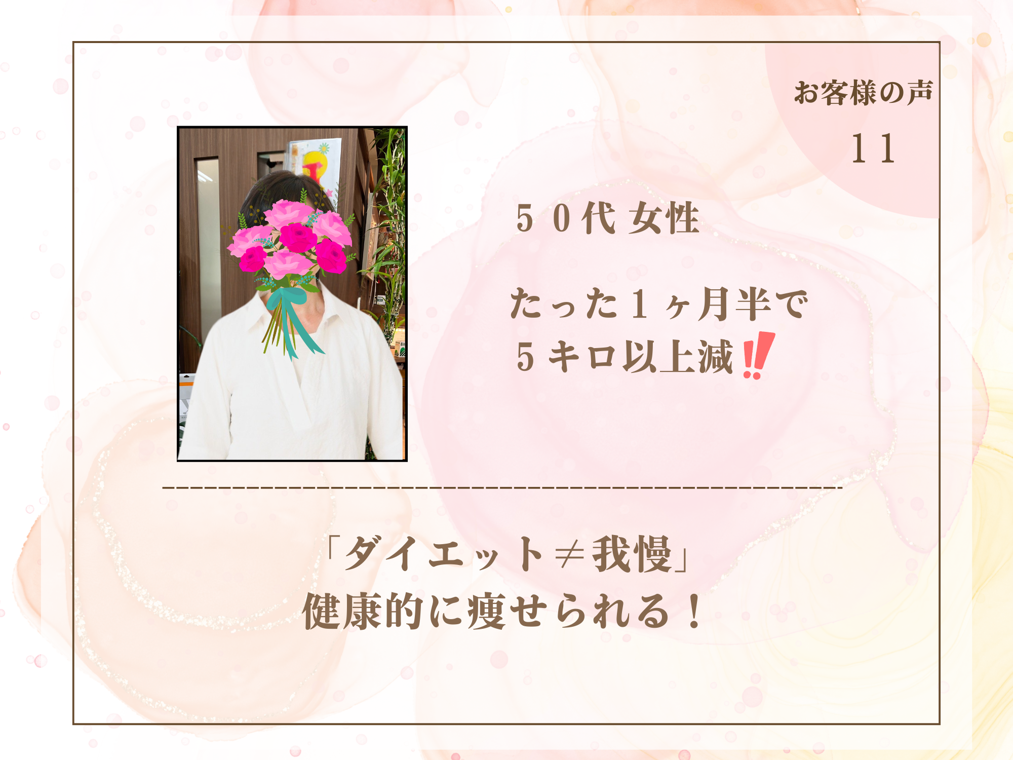 ダイエットを成功してからも、少しですが食生活を意識するようになりました。健康相談も気軽にできるので、安心して相談できます。先生や、スタッフの方たちも明るく親切に、接してくださいます。ここに、来ると元気が出ます!